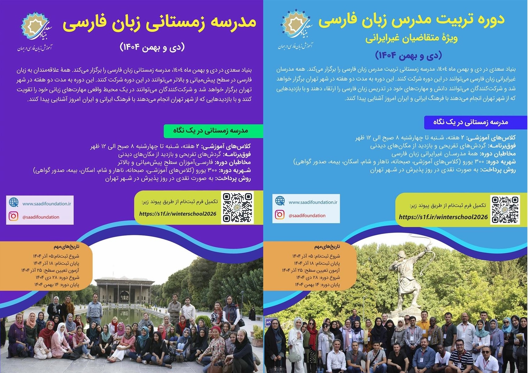 بنیاد سعدی، در دی و بهمن ماه 1404، مدرسه زمستانی زبان فارسی برای علاقه مندان به زبان فارسی در سطح پیش میانی و بالاتر و همچنین دوره‌های تربیت مدرس برگزار می‌کند.